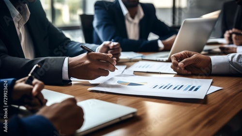 Close-up cropped photo of a meeting of businessmen in the office. Men wearing suits work with a laptop. with papers and a pen at the table.