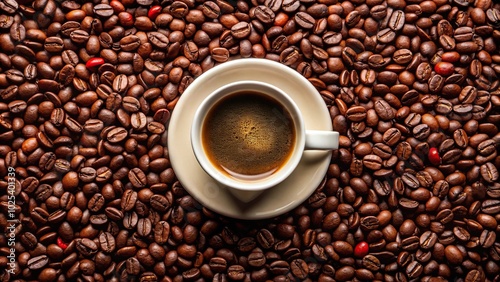 Close-up cup of coffee stained with lipstick and surrounded by coffee beans