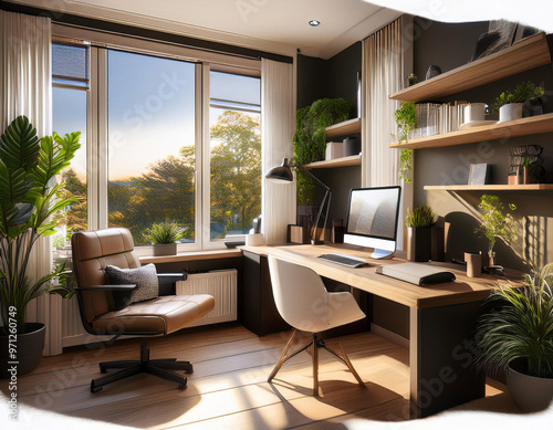 Close-Up Depiction of a Home Office Setup, Featuring Ergonomic Furniture, Productivity Tools, and Comfortable Work Environment