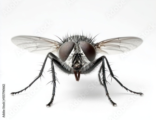 Close-up detailed view of a common housefly with transparent wings, large compound eyes, and bristly legs on a white background