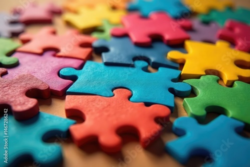 Close-up diverse colored puzzle pieces fitting together , unity, cooperation, colors