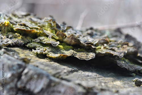 Close-up dry rotten mushrooms with fluted wavy brown, gray, green head texture on old tree stump bark, background texture, side view texture, horizontal