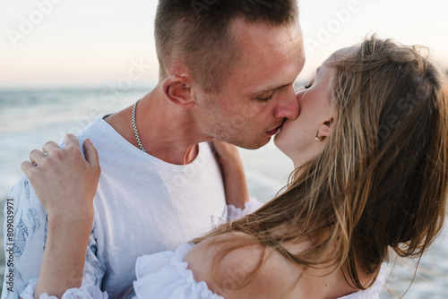 Closeup face. Female kissing and hugging male stand on beach ocean and enjoy sunny summer day on vacation. Woman kisses man on sand sea. Couple in love embraces on the seashore. Spend time together