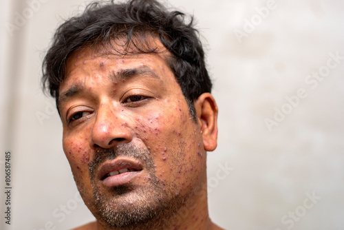 closeup face of a man who having varicella blister or chickenpox or Monkeypox new disease dangerous over the world.