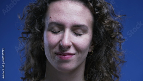 Close-up face of woman closing eyes feeling relief smiling after accomplishing task. Stress-free emotion of 20s person feeling happy and relaxed