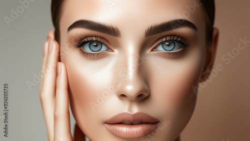 Close-up facial features, piercing blue eyes, perfectly groomed eyebrows, flawless skin, warm tones, high contrast, beauty photography, soft lighting, ultra-detailed, photorealistic, 8k resolution, be