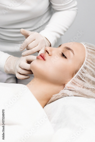 close-up, female lips. Surgeon, in medical gloves, carefully and slowly injects hyaluronic acid into woman's lips with a syringe. lip augmentation procedure. beauty injections. Plastic surgery.