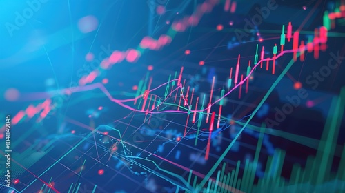 Closeup financial chart with uptrend line candlestick graph in stock market on blue color monitor background
