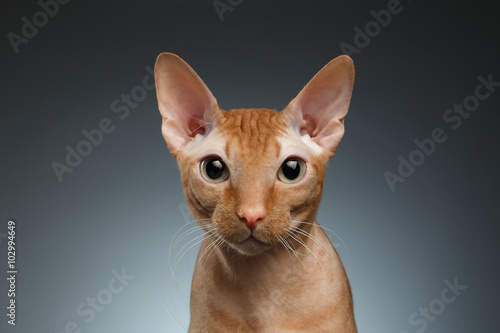 Closeup Funny Ginger Sphynx Cat Curiously Looking in camera on background
