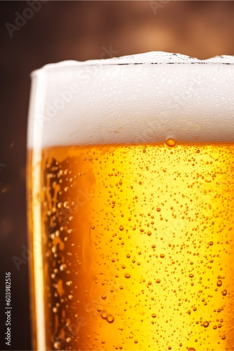 Close-up glass of cold beer with foam as texture and background, post-processed, generative ai