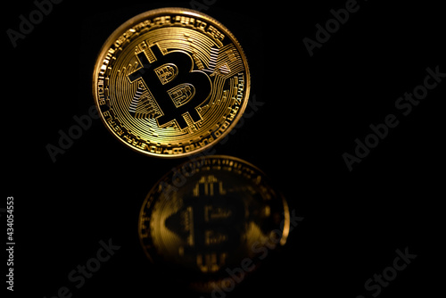 Closeup golden bitcoin with reflection isolated on black background. Bitcoin is reflected in the mirror.