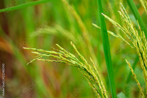 Closeup green ear of rice in the field