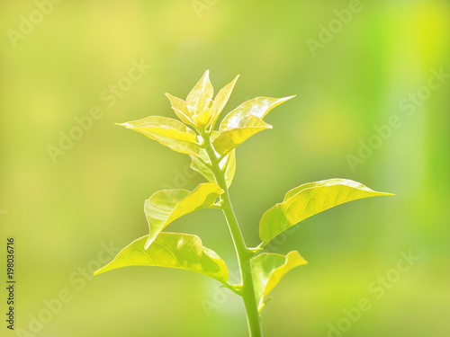 Closeup green plant sprout with blurry green and yellow background and negative space for text, abundant natural resources concept, World Environment Day concept