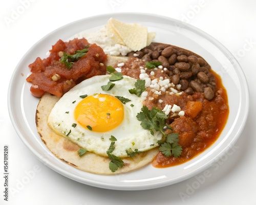 Closeup Half Cut Huevos Rancheros Showing Inside Layers on White Background