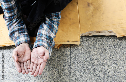Close-up hand of homeless man and wish money from people on walking street.
