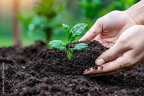 Closeup hand of person holding abundance soil with young plant. Hands holding a sprouting plant in soil