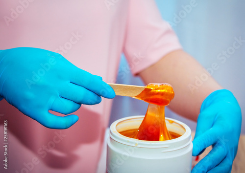 Close-up hands of cosmetologist in blue gloves preparing golden colored waxing paste on spatula for sugaring depilation, hair removal beauty procedure.