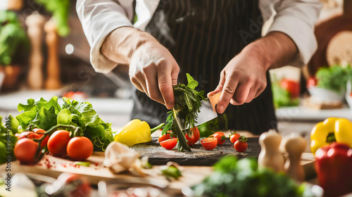 Closeup hands of male professional gastronomy chef cutting or chopping vegetables, tomato parsley and pepper on cutting board in kitchen interior, preparing vegetarian meal food, healthy oraganic meal