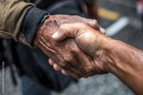 Close-up handshake for help homeless man on walking street in the capital city.