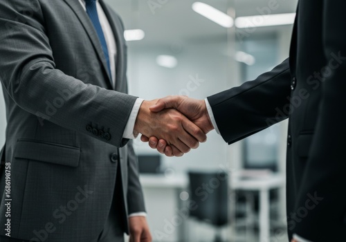 Close-up Handshake of Businessman in Grey Suit with Blurred Modern Lighting Background