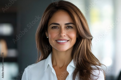 Closeup headshot face portrait of beautiful successful hispanic young business woman looking confident at camera. generative ai