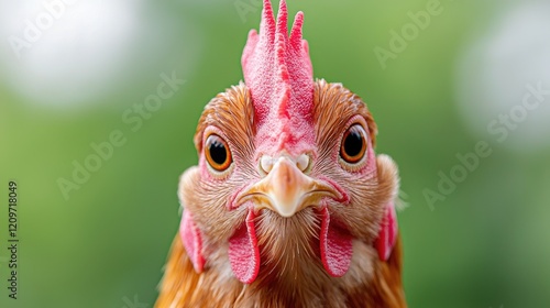 Close-up hen portrait, farm background, rural scene, poultry farming