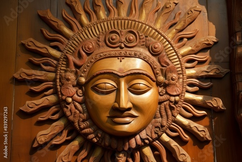 Close-up image of a beautifully carved wooden sun with intricate designs