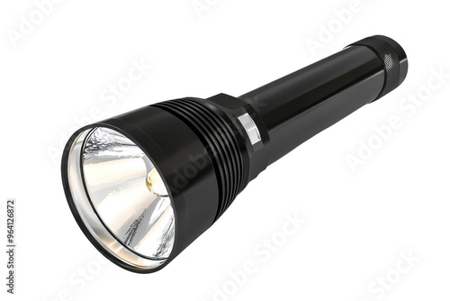 Close-up image of a black flashlight with a modern design, shown isolated against a transparent background.
