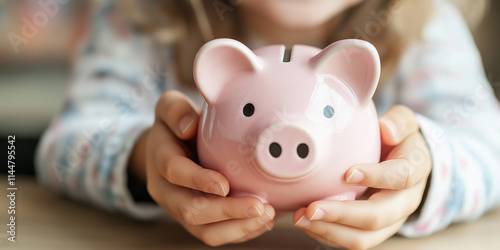 Close-up image of a child holding a pink piggy bank, symbolizing savings and financial security, accompanied by a sense of innocence and responsibility.