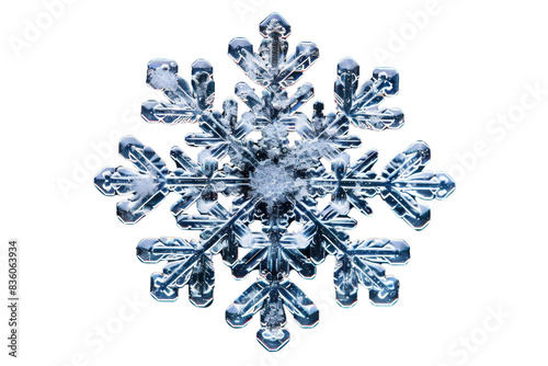 Close-up image of a detailed snowflake with intricate patterns, showcasing the beauty of winter nature in crystal clear macro photography.