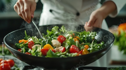 Closeup image of a female chef cooking fresh mixed vegetables salad in kitchen : Generative AI
