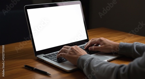 Close-up image of a man working on laptop computer at a table, typing on the laptop keyboard. the laptop with a white screen mockup