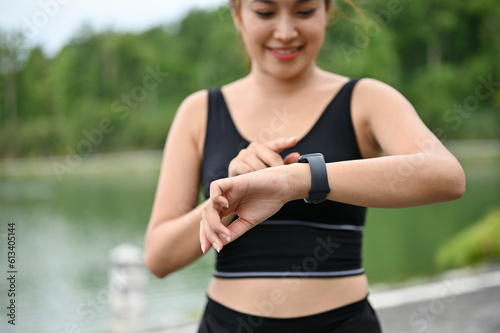 Close-up image of a sporty Asian woman checking her calories burned on her smartwatch