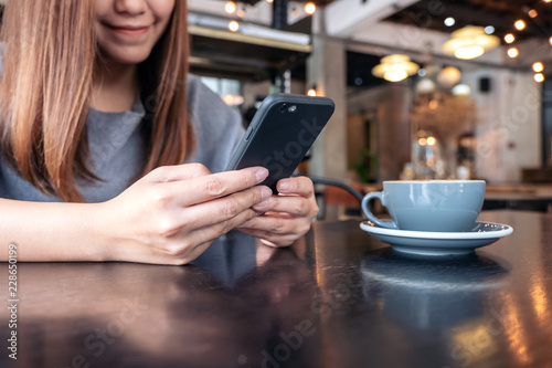 Closeup image of a woman holding and using a smart phone with coffee cup on table