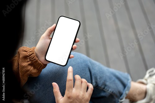 Close-up image of a woman using her smartphone while sitting outdoors street.