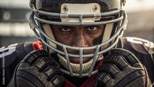 Close-up image of an american football player wearing a helmet ready for action on the field during game day