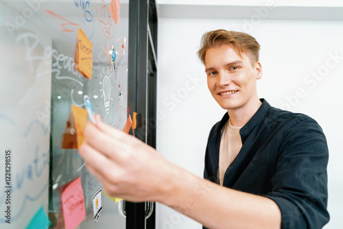 Closeup image of professional caucasian businessman presenting business marketing idea with confident by using mind map and colorful sticky note. Start up project concept. Portrait. Immaculate.
