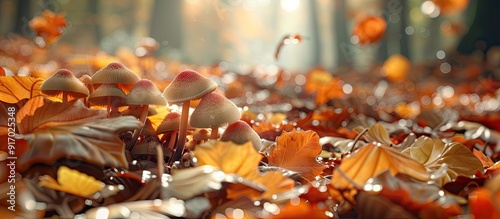 Closeup image of small fresh mushrooms growing amongst autumn leaves in a forest setting illustrating the concept of mushroom picking with a magical touch and copy space image