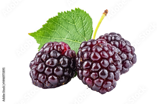 Close-up image of three dark purple blackberries with fresh green leaves. They appear ripe and ready to eat.