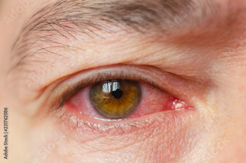 Closeup irritated infected red bloodshot eyes, conjunctivitis