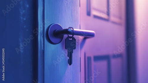 Close-up key in door handle, modern home interior. Possible use Stock photo