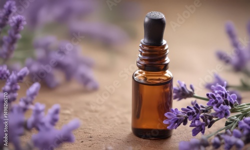 Close-up lavender blossoms, essential oil dropper, floral detail, liquid, botany