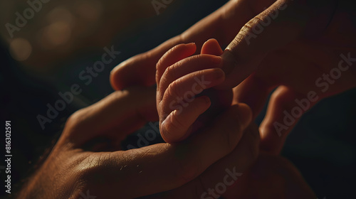 Closeup little hand of child and palm of mother and father The newborn baby has a firm grip on the parents finger after birth A newborn holds on to moms dads finger : Generative AI