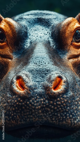 Close-up look at a hippopotamus showcasing intricate skin textures and expressive eyes in a natural setting during twilight hours