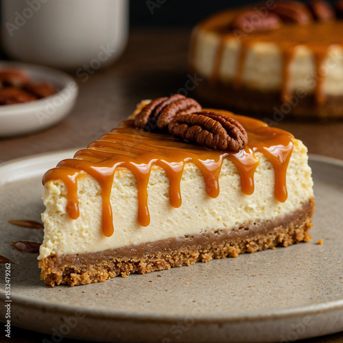Close-up macro of a decadent caramel-drizzled cheesecake slice topped with roasted pecans, highlighting the creamy filling, crumbly graham cracker crust, and glossy caramel drizzle.