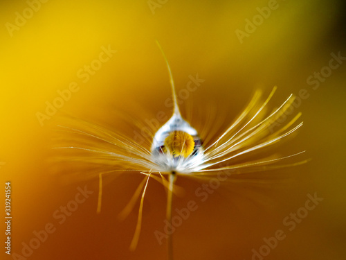 Close-up, macro of white dandelion, Taraxacum seed in spring , with water drops on colorful green background