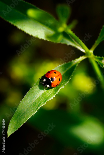 Close-up macro photo of a red ladybug resting on a green leaf, captured in soft natural sunlight. The vibrant colors and shallow depth of field highlight.