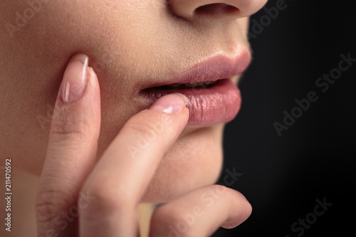 Closeup macro photo of woman's lips with natural lip balm