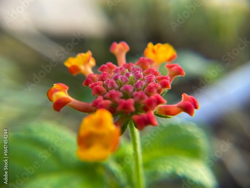 Close-up macro shot of Lantana camara flowers in vibrant orange and yellow hues, showcasing delicate textures and natural beauty in full bloom.