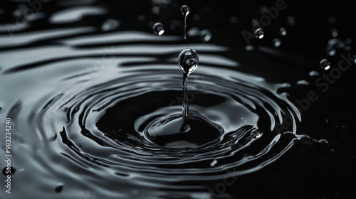 "Close-up macro view of a raindrop on a black background, rendered in isometric 3D. The droplets are vividly detailed, showcasing the texture and reflection of water."